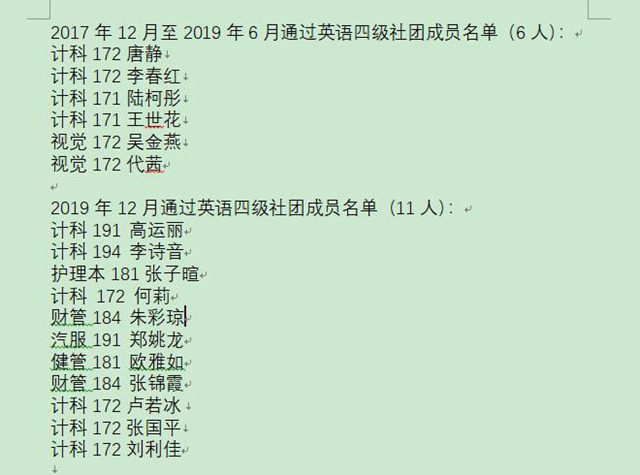 一分耕耘,一分收获。近日,拾光英语竞级社团经查询统计,社团成员中又有11人通过了2019年12月中旬的英语四级考试并获得英语四级证书。 拾光英语竞级社团2019年4月份成立,旨在带领更多同学一起学习英语,营造良好的...