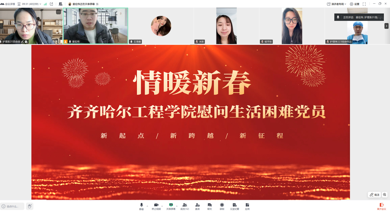 新春将至,温暖先行。2月5日,学校党委组织“情暖新春”线上慰问活动,通过视频会议方式,向生活困难学生党员送上党组织的深切关怀与新春祝福。活动由医学院党委副书记姜宏伟主持,医学院党委宣传委员苏森森、组织委员马静、纪检委员金璐、辅导员代表及困难学生党员共同参与,在云端传递组织的温暖,共迎佳节。会议伊始,姜宏伟代表学校党委,向与会困难学生党员致以诚挚慰问和节日祝福。他与同学们亲切交流,详细询问大家在...