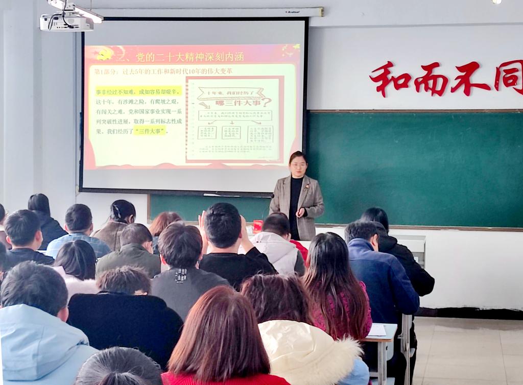 2月21日,学校党委党的二十大精神宣讲团成员、党委委员、副院长白雪在图书馆310教室以“教育科技人才一体、筑牢国家强盛之基”为题作党的二十大精神专题宣讲,机电工程系全体教师及机关第四党支部党员聆听。 白雪副...